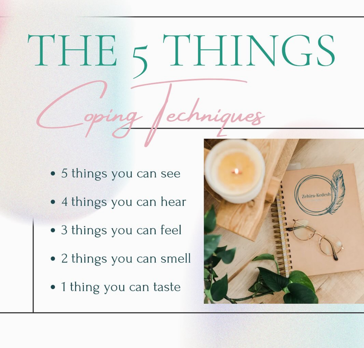 The 5 things technique is a coping strategy to help navigate the overwhelming emotions associated with trauma and other events that cause emotional distress.